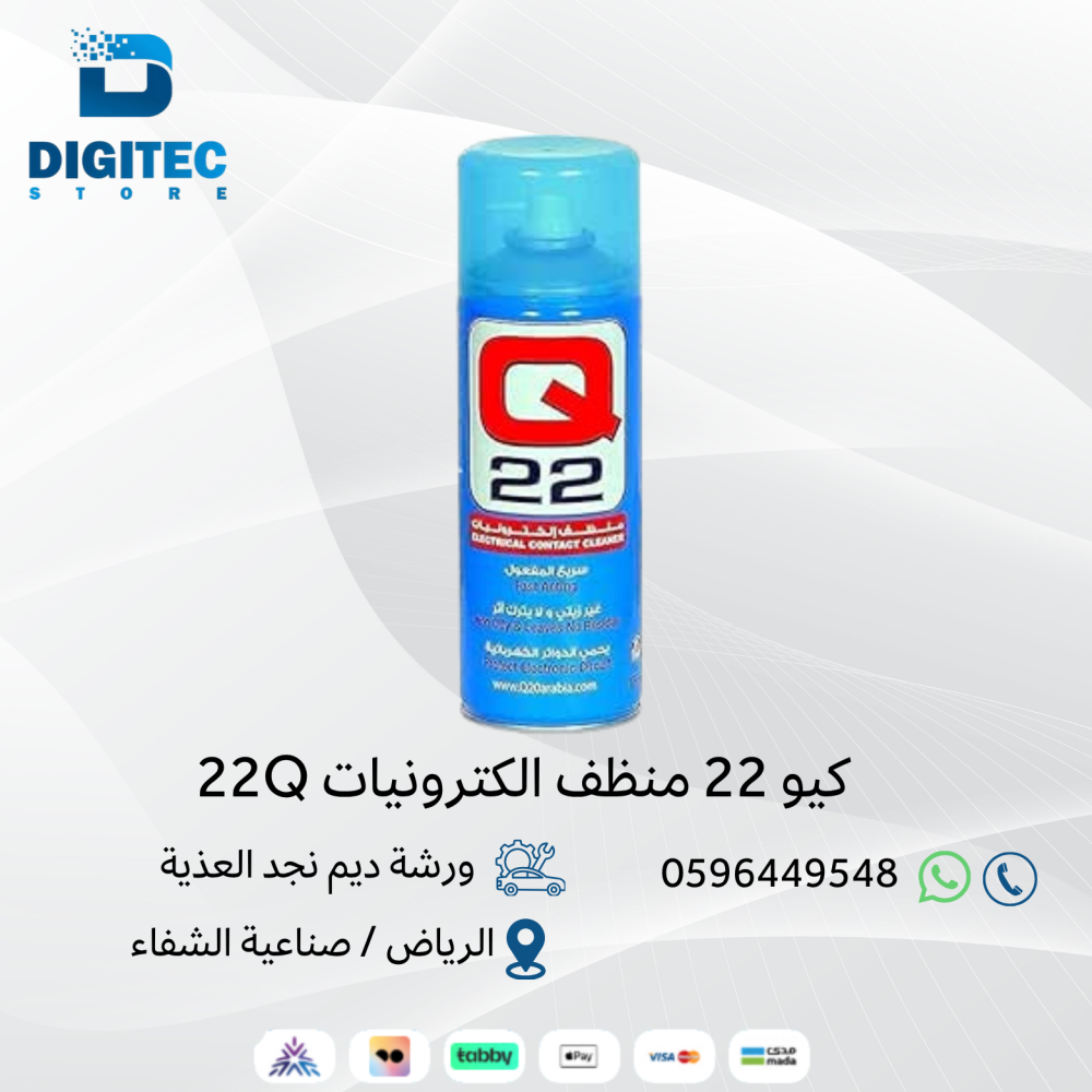 منظف كيو 22 هو حل مثالي لتنظيف الأجهزة الإلكترونية وأجزاء الاتصالات الكهربائية. يتميز بتركيبته الفعالة التي تزيل الأوساخ، الزيوت، والأتربة من الموصلات الكهربائية دون التأثير على جودة الأجهزة.